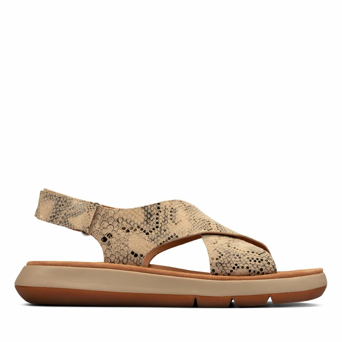 Jemsa Cross, an ultra-wearble crossover summer sandal that effortlessly combines style and comfort. Its premium taupe snake feels soft and breathable against the skin, and the flex groove rubber sole of recycled content makes is a sustainable choice.